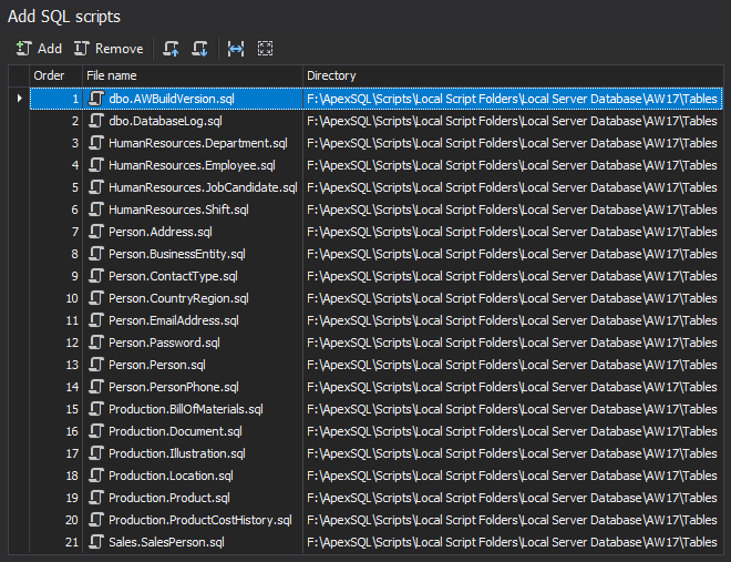 Add script files that should be combined. The order of the scripts execution can additionally be changed, as sometimes the order of scripts can determine and change the whole deployment process, or even prevent the deployment from being executed. For changing the order of scripts, there are the Up/Down buttons available: