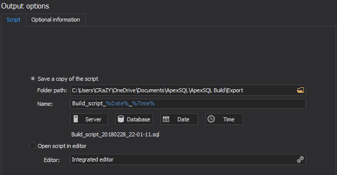 After selecting the necessary scripts, ApexSQL Build shows the Output options step which offers users to create and Save a copy of the script or to Open script in editor in the Script tab:
