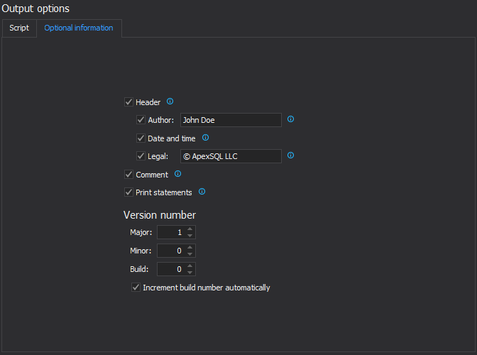 Additionally, there’s a possibility to add the version number of the script, located under the Optional information tab, to keep track of script packaging and changes in case of repeating the session with additional updates, along with the Header options: