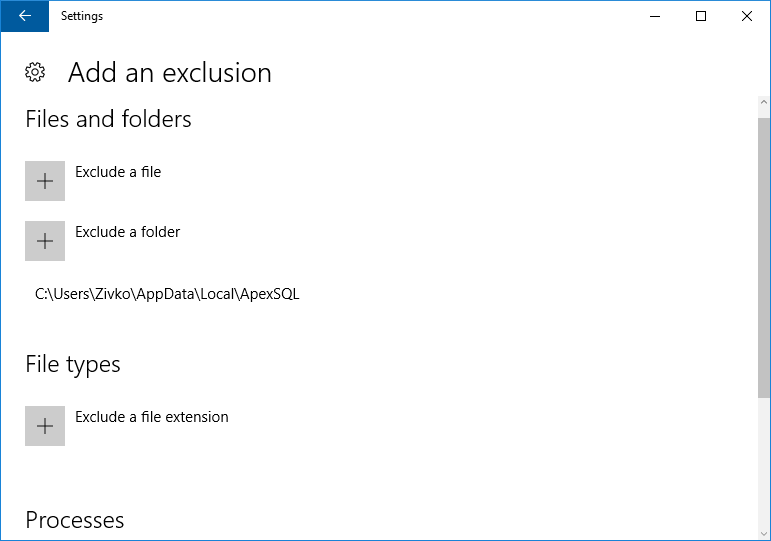 The ApexSQL folder should now be placed in the list under the Exclude a folder section: