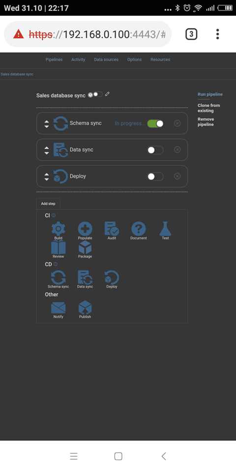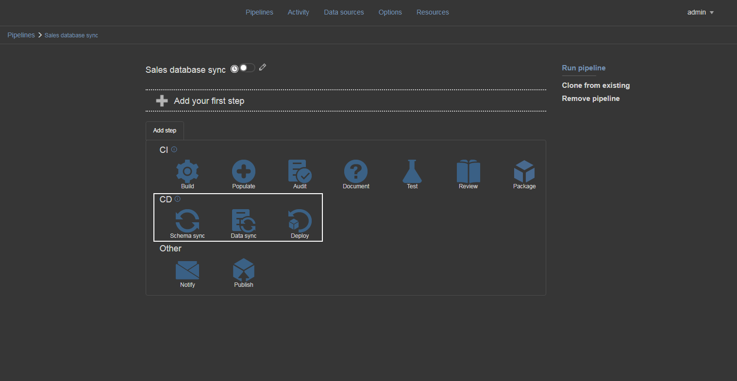 As Web dashboard is designed for continuous integration and continuous delivery tasks there is a selection of steps for both processes but for automating database synchronization the needed steps are Schema sync, Data sync, and Deploy steps grouped in the continuous delivery section (CD). Depending on what type of database synchronization is needed the appropriate step should be used. Let’s say that we have both daily schema and data changes that require scheduled synchronization.