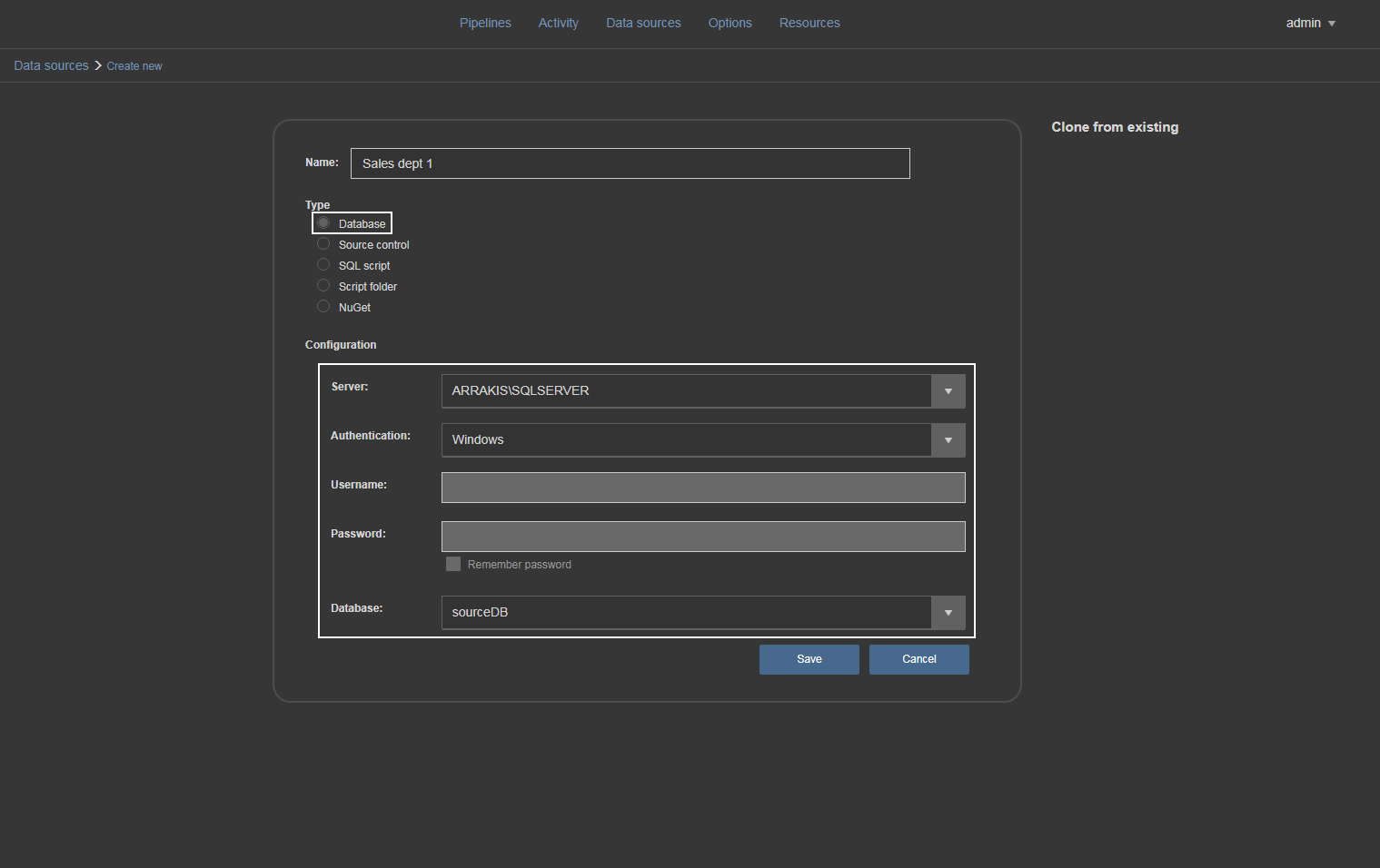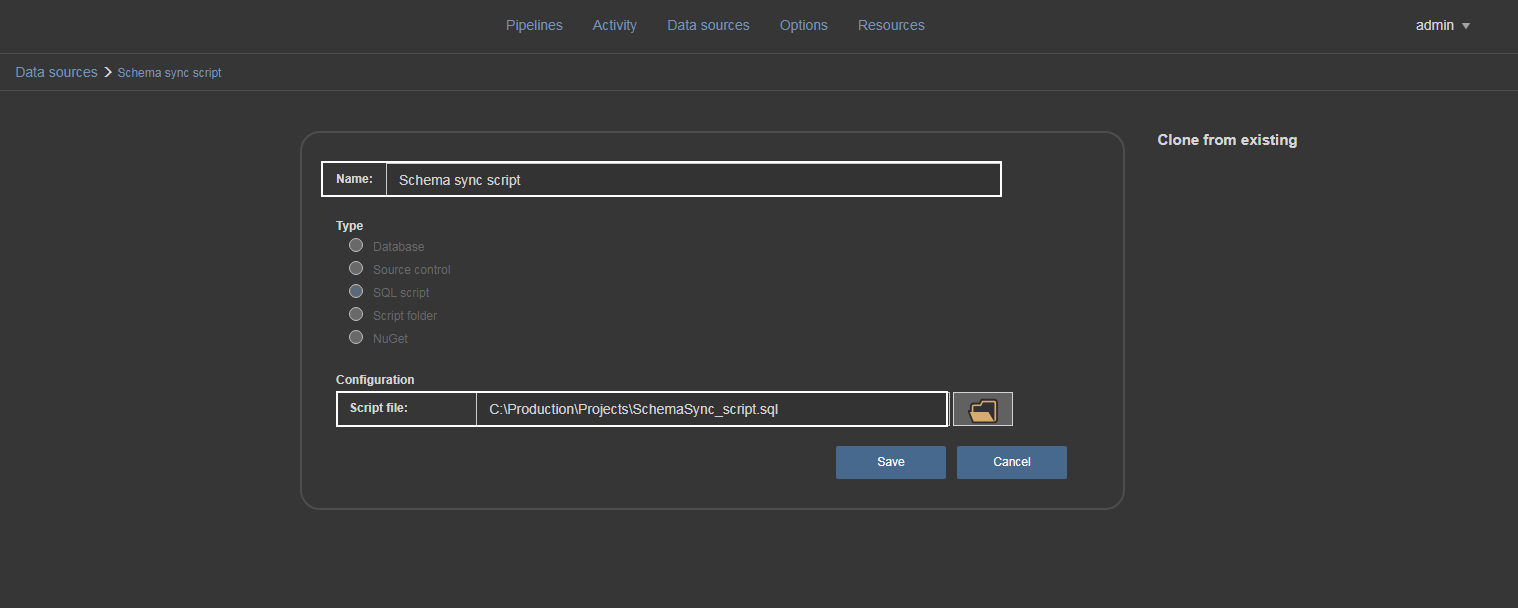 It is created the same way as the rest of the data source types. Click on Add button and in the opened form enter data source name and path to appropriate sync script (created previously by Schema and Data sync steps)