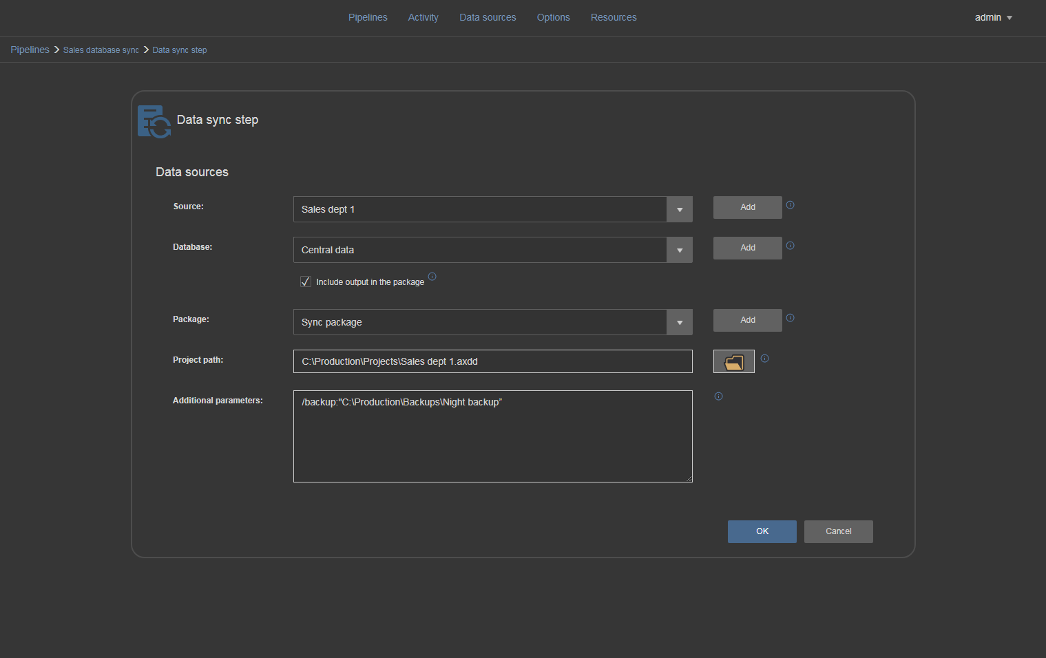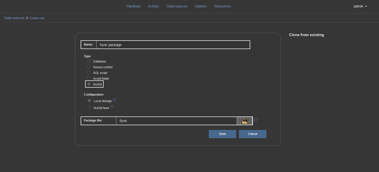 These packages are commonly used for continuous integration and continuous delivery workflows so the option to create them is present here. The outputs will be a database comparison summary and report and the schema synchronization script, all automatically created by the ApexSQL Diff tool. In case Include output in package option is not used, those outputs will be created but not stored in the package. There is one advantage of using a NuGet package for the database synchronization task and that is to easily use stored sync scripts for Deploy step which will execute them instead of providing paths manually to those scripts which will be explained later. Creating NuGet package data source is as easy as those database type data sources. Just type in the data source name and the NuGet package file name then confirm with save.