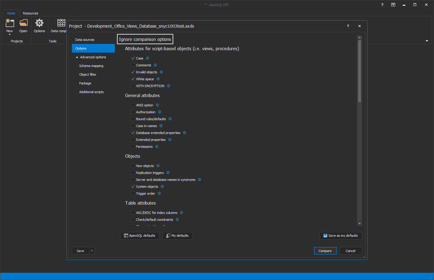 Now, when database synchronization source and destination are set, the natural question would be: “There aren’t any options, I want to synchronize only a few items, not an entire database?” – Oh, but there are options, abundance of options. As the tool was designed for simplification of continuous integration setup these options can be set as template in the ApexSQL Diff project file and imported by providing the project file path in the designated field.
