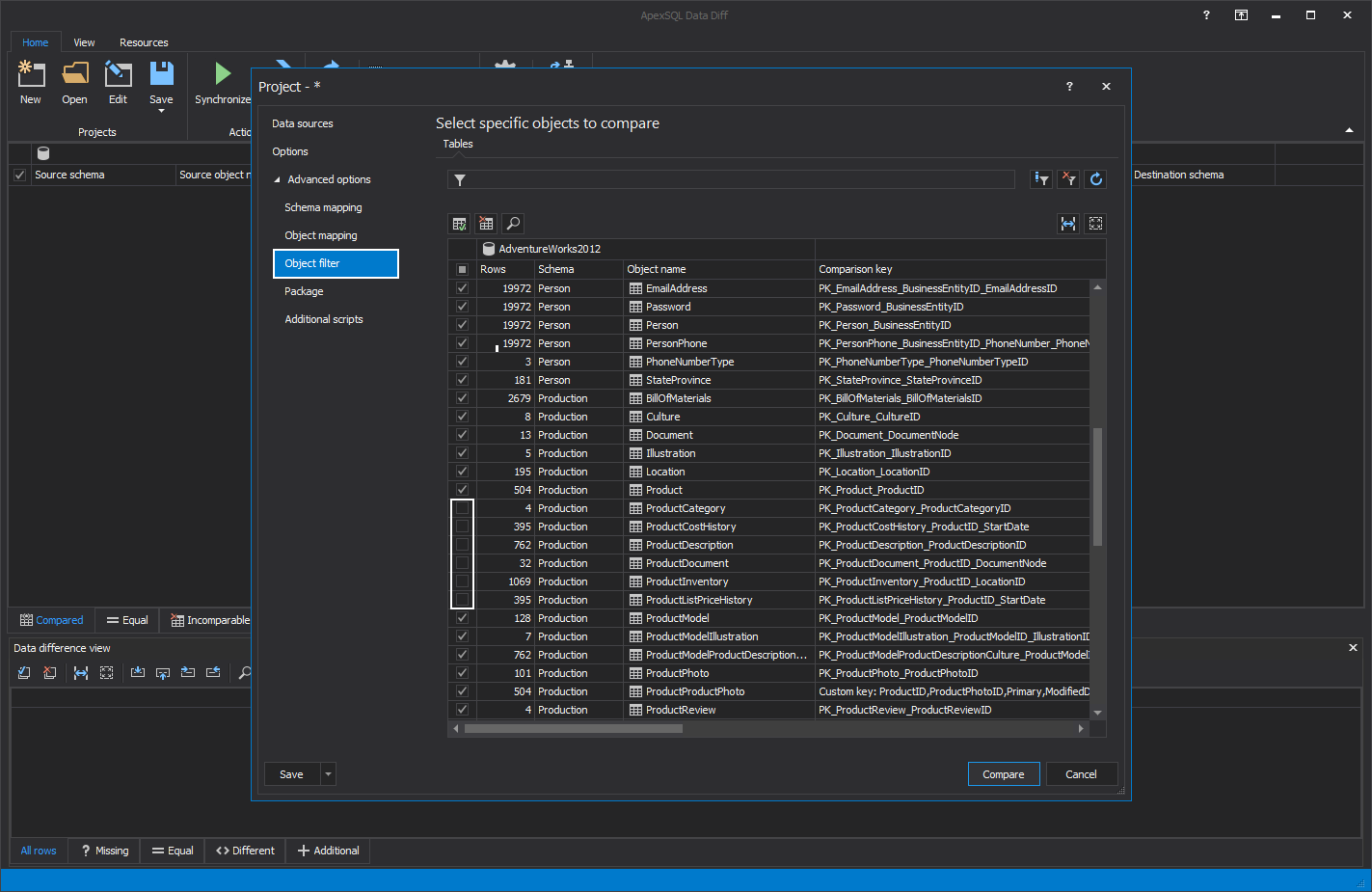 Synchronization options can be imported with ApexSQL Data Diff project file where there can be set some row filtering