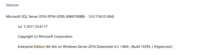 When the version in SSMS is shown completely after running select @@VERSION in the documented SQL Server Instance