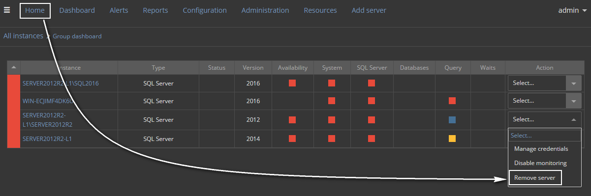 A: To remove an SQL Server instance, click on the Home link in the main menu to open the all instances dashboard. In the Action column, expand the drop down menu for the SQL Server that should be removed and click Remove server.