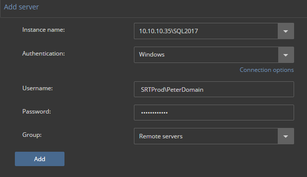 To add a remote SQL Server instance to ApexSQL Monitor, or a local one that’s not shown in the drop-down list, type the remote SQL Server instance name as <Machine_Name>\<SQL_Instance_Name>, or <Machine_IP_Address>\<SQL_Instance_Name>.