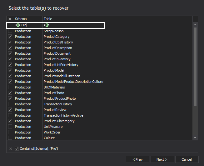 Select tables to recover. To narrow down the list and find the required tables quickly, use the filter row at the top of the list: