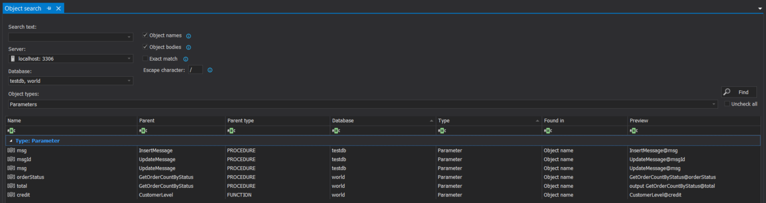 To find all parameters for the stored procedures and functions in a MySQL database, in the Object types drop-down box, check the Parameters checkbox and click the Find button: