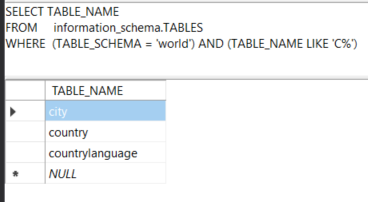 WHERE TABLE_SCHEMA = '' AND TABLE_NAME LIKE 'C%';