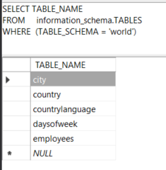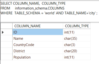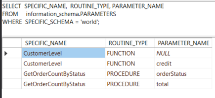 SHOW PROCEDURE STATUS WHERE DB='world';Under the PARAMETERS table of the MySQL information_schema database, information related to stored procedures and function parameters can be found. The PARAMETERS table does not include built-in SQL functions or user-defined functions (UDFs):