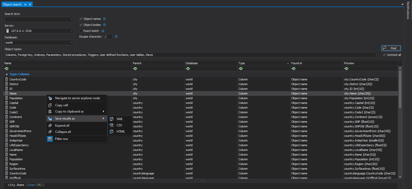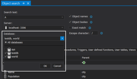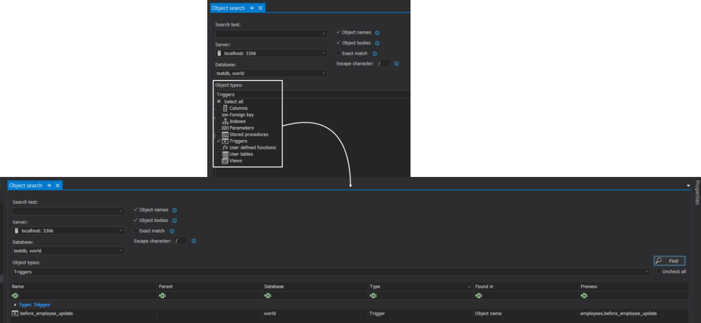 To get search focus on a particular object, type from MySQL database, for example, to search only triggers, in the Object types drop-down box, select the only the object type of interest. In this case, that is the Triggers item, so click the Find button. This will find all triggers for the world and testdb databases: