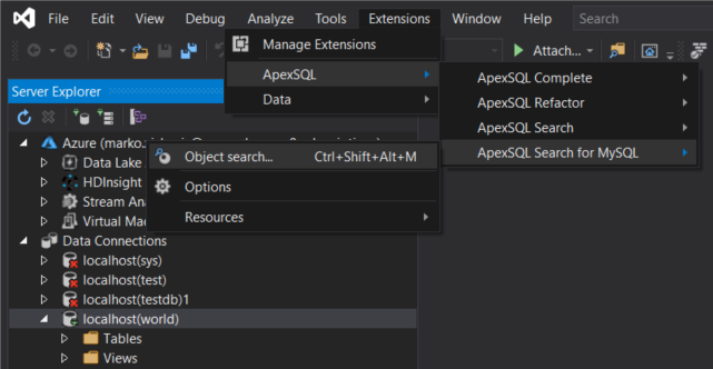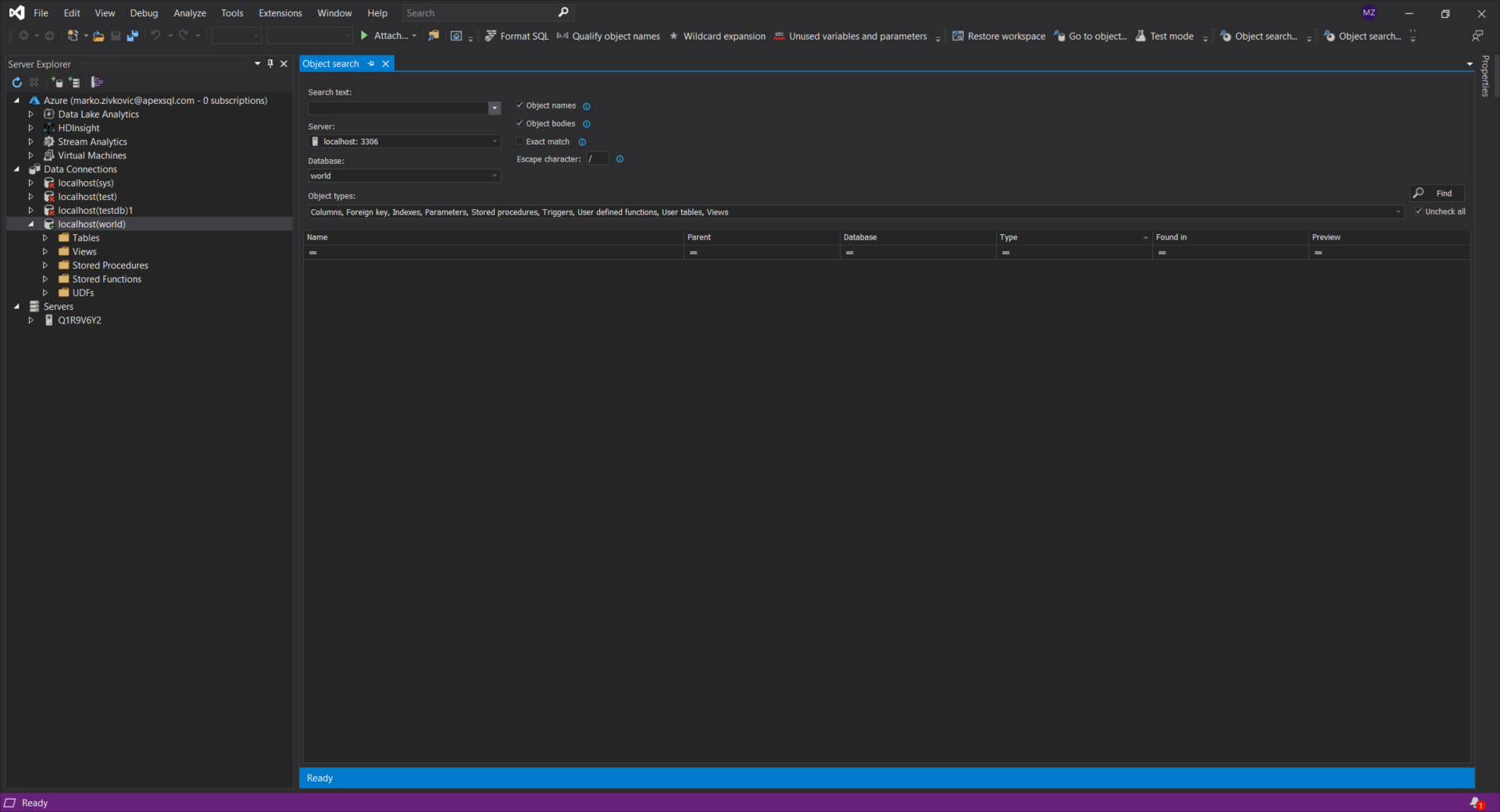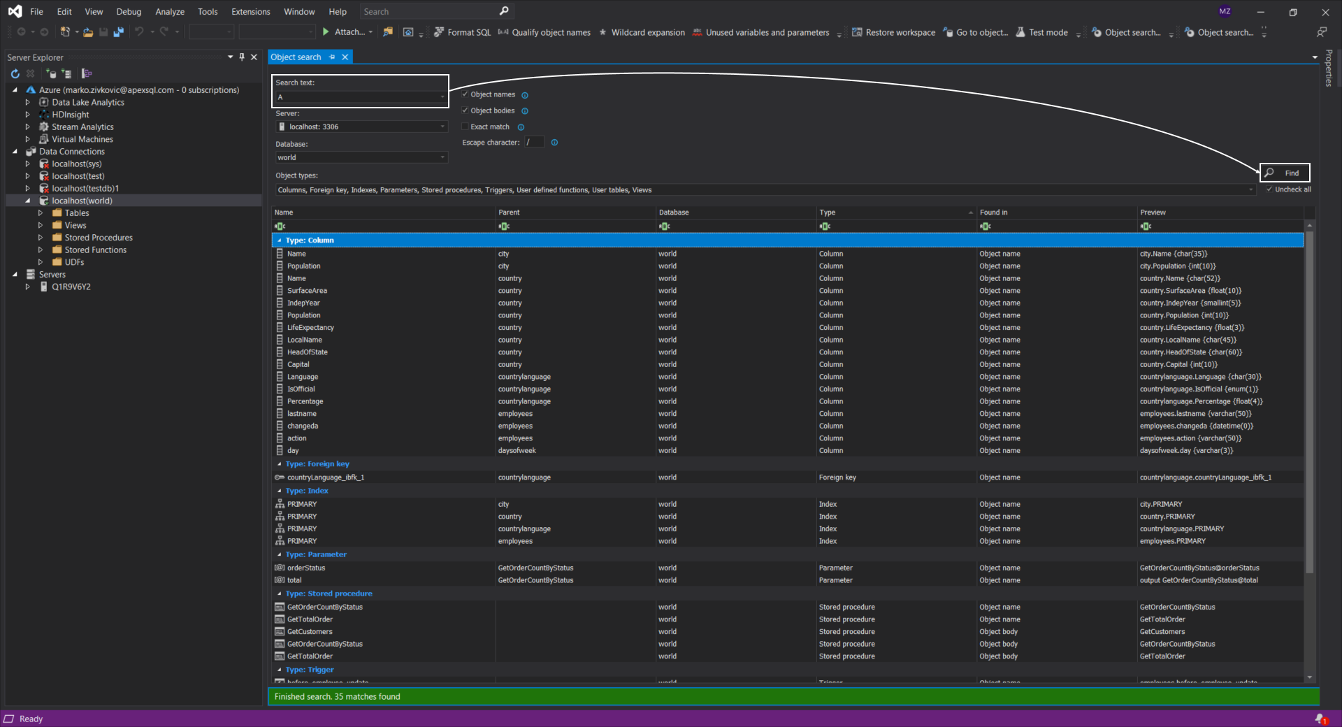 ApexSQL Search for MySQL is a free MySQL search add-in that can be integrated into Visual Studio and can perform all the above-mentioned search options, just like the MySQL information_schema database with only one difference, there is no need to type any line of code in order to find an object of interest.