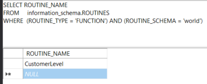 WHERE(ROUTINE_TYPE = 'FUNCTION') AND (ROUTINE_SCHEMA = '');