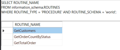 The code for finding all procedures under a MySQL database is similar to the code for finding all functions, just in the Where clause, under the ROUTINE_TYPE, set the ‘PROCEDURE’ value: