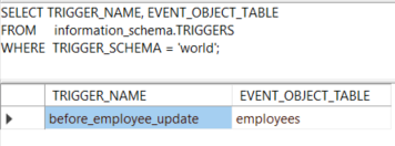 SELECT TRIGGER_NAME, EVENT_OBJECT_TABLE