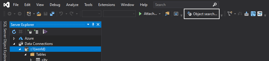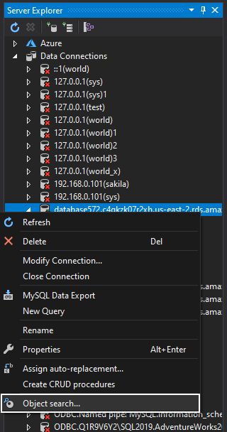 Another way to open the Object search panel is to select a database in Server Explorer panel, right-click and, from the context menu, choose the Object search command: