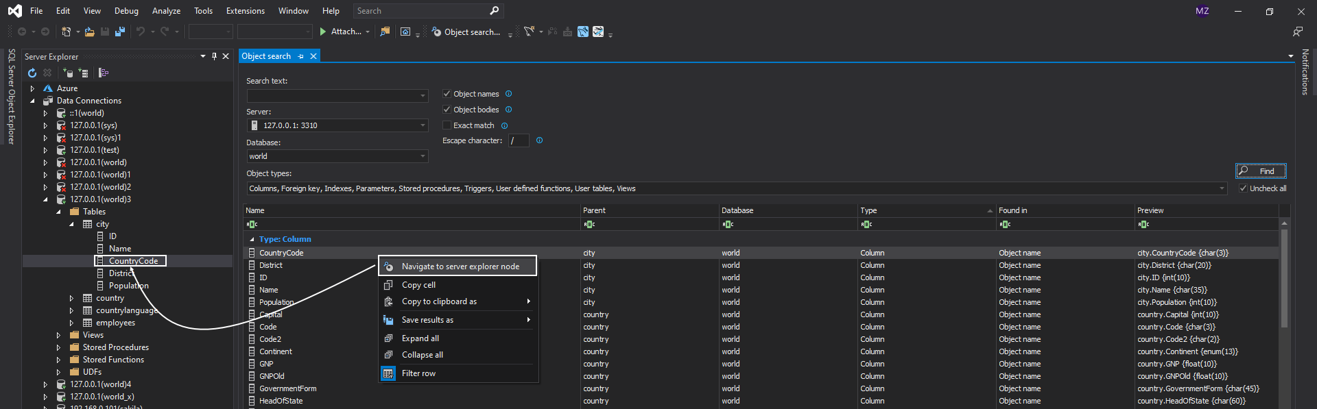 By using the Navigate to server explorer node command from the context menu of the search results grid, the searched object in a database under the Server Explorer pane can be easily located.
