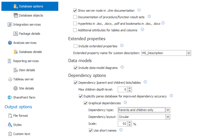 If there are any objects that depend on the documented objects, they can be scripted by selecting Dependency (parent and children) lists/tables on the Database options tab. Including dependent objects improves the documentation accuracy