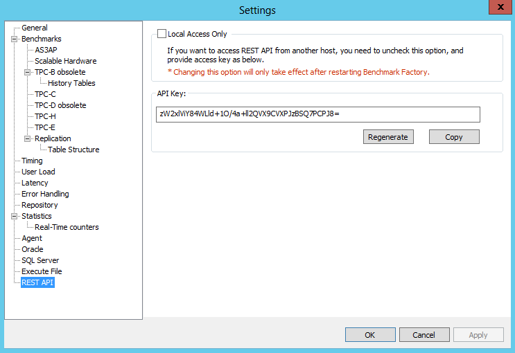 From the Benchmark Factory 8.4, Benchmark Factory provide REST API service as a HTTPS server. The default setting for REST API is Local Access. The check-box 'Local Access Only' is in Settings REST API section. Whether it checked or not, from local access to REST API works. Below are examples: