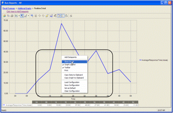 To modify a graph view, right-click a Benchmark Factory graph to display a drop-down list that allows you to customize graph settings. Whether you are viewing a real-time graph or one in Benchmark Factory Run Reports, Benchmark Factory uses the same graphing tool. In most cases you will find that the graphs are presented in the most meaningful form (Line Graphs or Bar Graphs based on the data being presented.)
