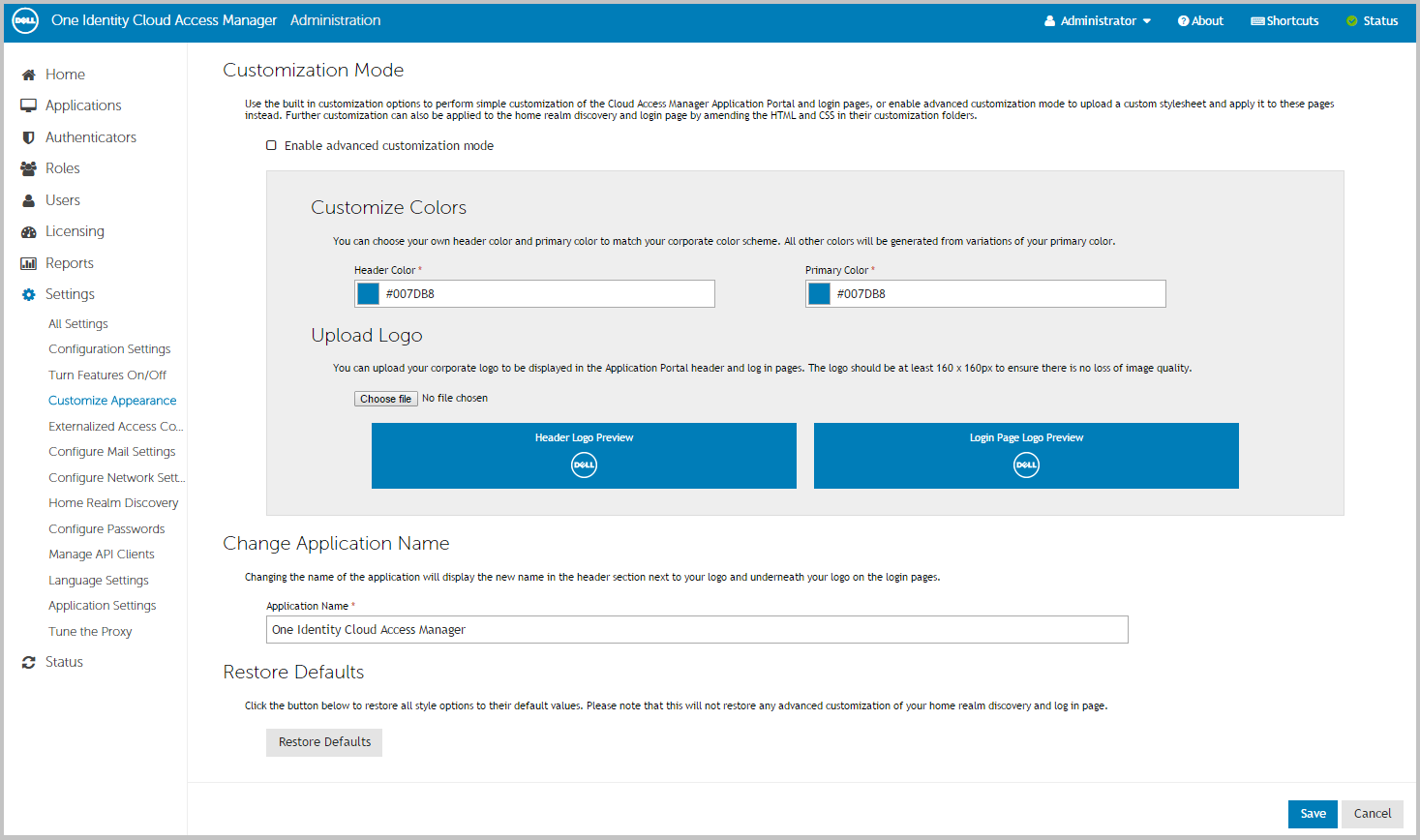 You can easily change common aspects of the look and feel using the Customize Appearance options in the Cloud Access Manager Administration User Interface (UI). For example, you can change the colors, company name and logo in the Admin UI. For more extensive changes, you can manually edit the Cascading Style Sheet (CSS) file that is used to style Cloud Access Manager from the Admin UI. If you cannot achieve the look you require by editing the CSS file, you can also edit the HTML of the Login and Home Realm Discovery (HRD) pages.