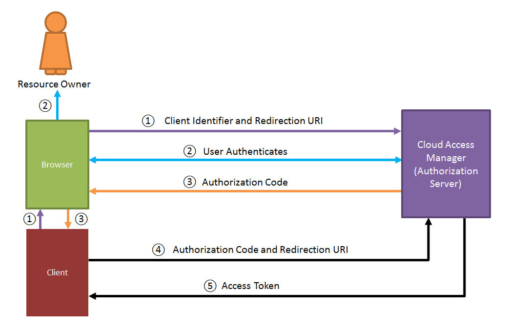 Cloud Access Manager authenticates the client, validates the authorization code, and ensures that the redirection URI received matches the URI used to redirect the client in step . If valid, Cloud Access Manager responds with an access token. The access token can then be used to access the required resource.