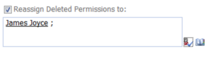 a.Check the Reassign Deleted Permissions to box. b.Select the user(s) to whom you want to copy the permissions. NOTE: If you entered the name of more than one user in the Delete Users field, the permissions of every one of those users (if different) will be reassigned to the target user. |