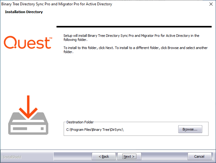The Binary Tree Directory Sync Pro for Active Directory and Migrator Pro for Active Directory installer can be used to install both Directory Sync Pro for Active Directory and Migrator Pro for Active Directory at the same time or individually. Migrator Pro for Active Directory should only be installed at the same time as Directory Sync Pro for Active Directory or if it has previously been installed on the same server.