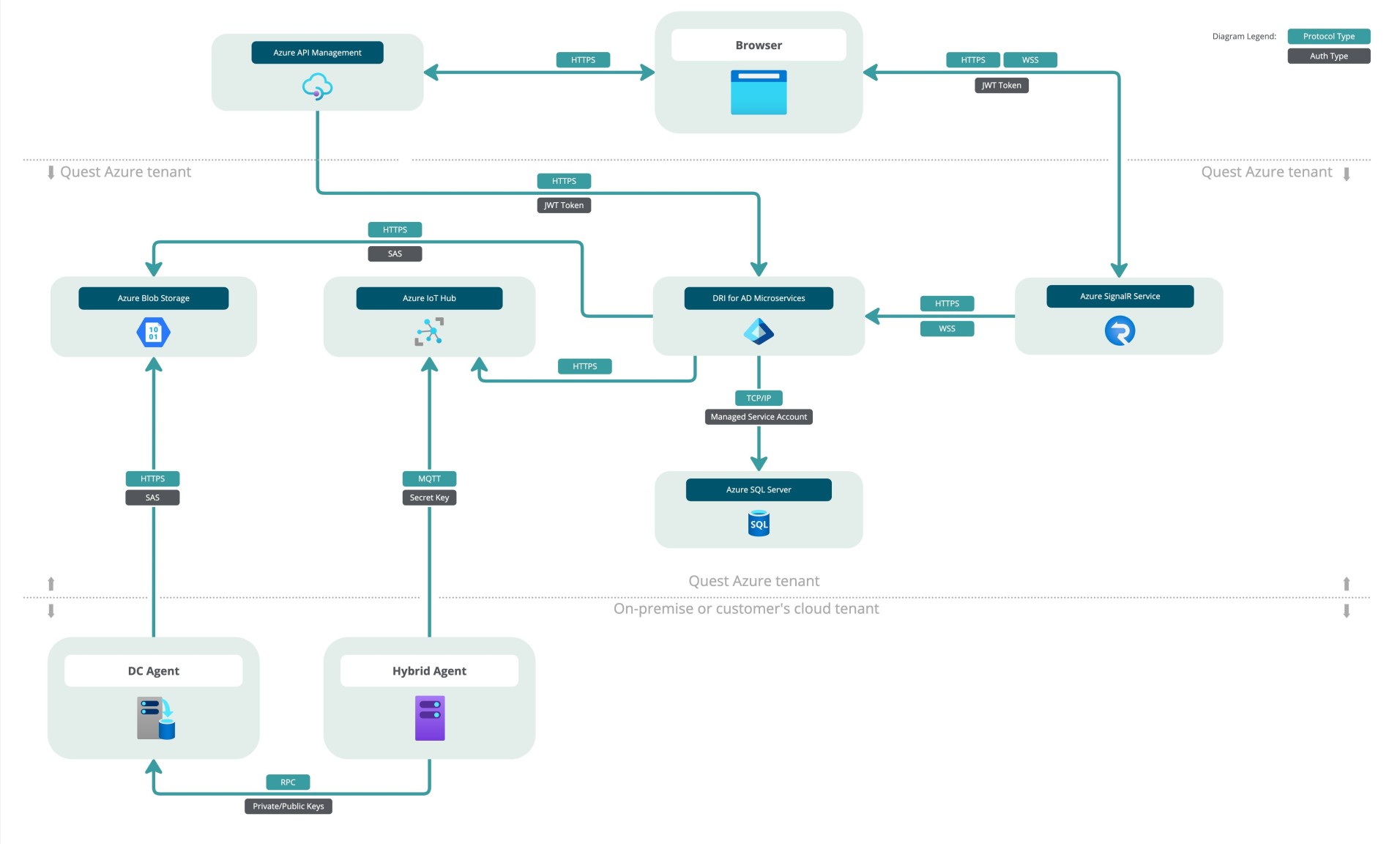 The hybrid agent communicates with the On Demand cloud through Azure’s IoT Hub service. The agent itself behaves as an IoT device. All communications with Azure are conducted over the MQTT protocol using the Microsoft Azure Device Client library.