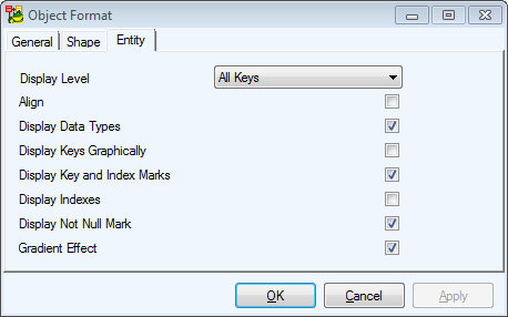 Defines display options for entities such as the display level, what properties should be displayed etc. Options for Physical model differ from those in Logical model. |