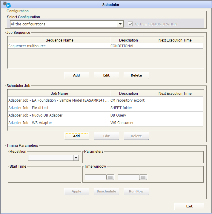 You can schedule a job using the standard timing parameters: the job will result in the execution of all the adapters belonging to the job sequencer definition and all of the selected workflow, in the configured order.
