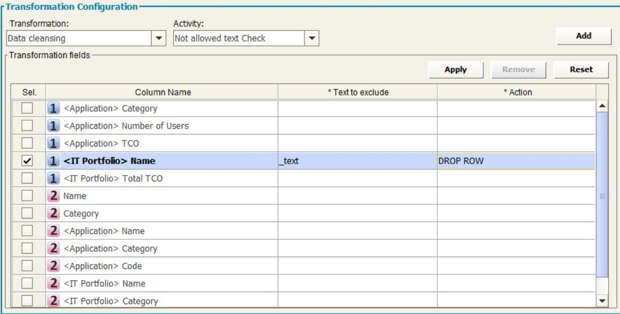 The “Not Allowed Text Check” Transformation applies when it’s required to check if in the selected column there is a specific string value and perform an action in the case of invalid data.