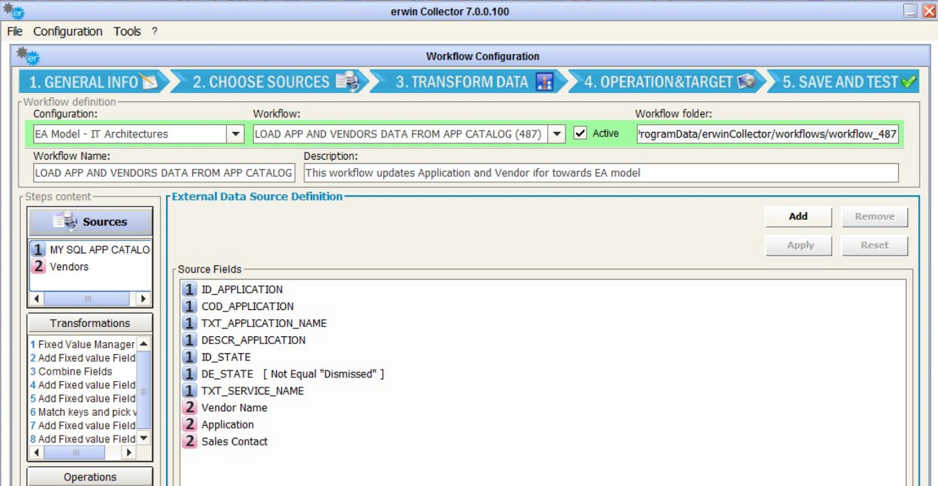 It’s possible to select one of these data sources to modify it. Please be careful, as when a user modifies the source of a workflow, all fields will be deleted for the transformation and mapping rules, where they are not required by the new source definition.