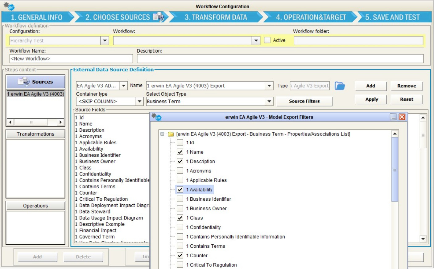 extract through a EA Agile V3 Adapter for the selected object type. The “Source Filters” button allow user to pick only the desired information, while default operation includes all of them.