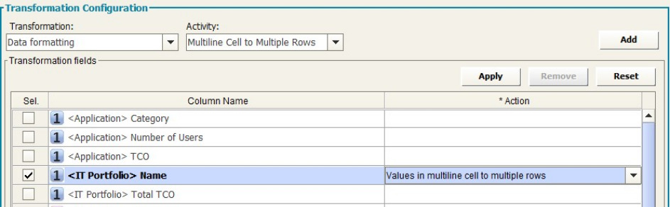 The “Selected Value in List” Transformation applies if it there is a column containing a multiline text, as when exporting from a CM model an object and a list of associated objects, and it’s needed to have a single item of that list, either the first or the last. The user can set the option on the source column, choosing between “First value in List”, “Last value in List”. All these configurations may be done separately for each source field.