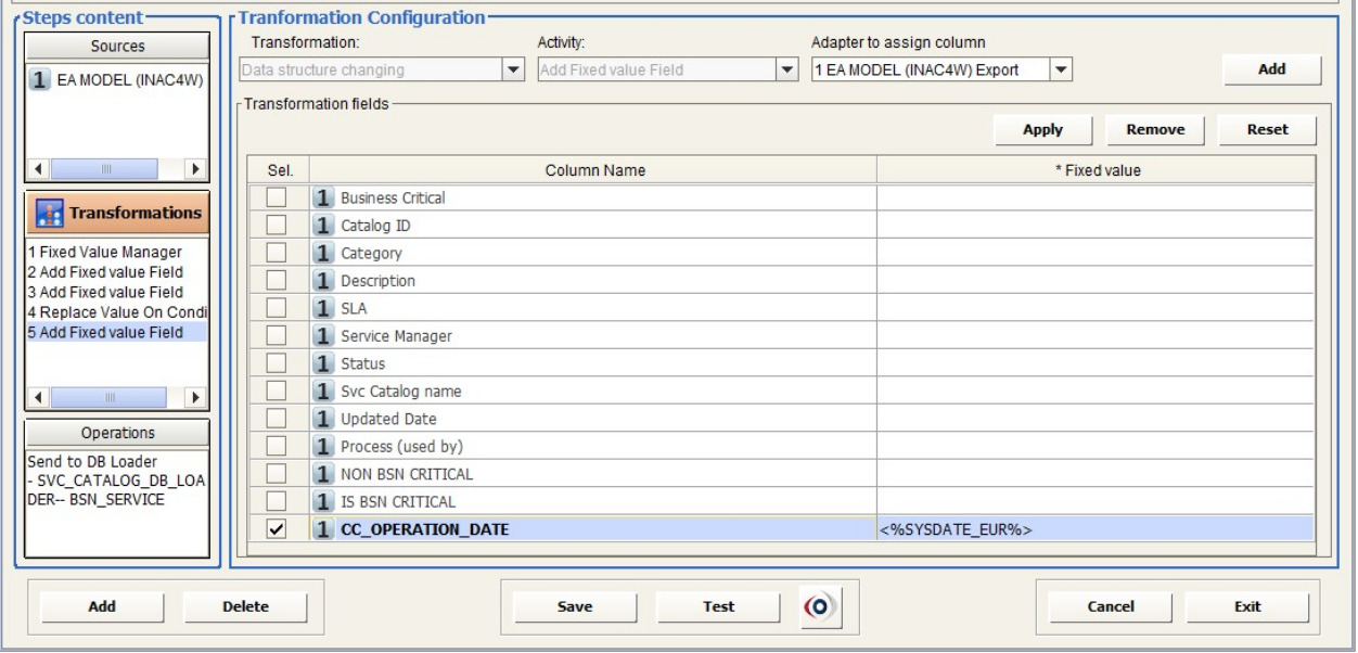 To optimize the data flow, filter source data in order to export only the more recently updated. Use then a “Data filtering”, “Fixed Value Manager” to manage only services with “Status” equal “6 – Production”.