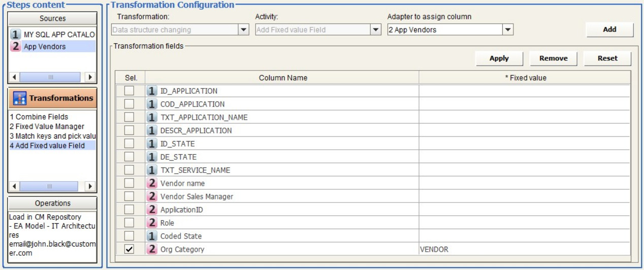 Choose “DATA STRUCTURE CHANGING” and “Add fixed value Field”, with name “Vendor Category” and value “VENDOR” and assign to Adapter “2 App Vendors”: