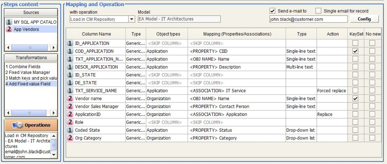 In the “Mapping and Operation” step, choose the “Load CM Repository”. The target model is the one related to the Model Configuration which the workflow has been assigned. Then map all the relevant source fields to target fields: