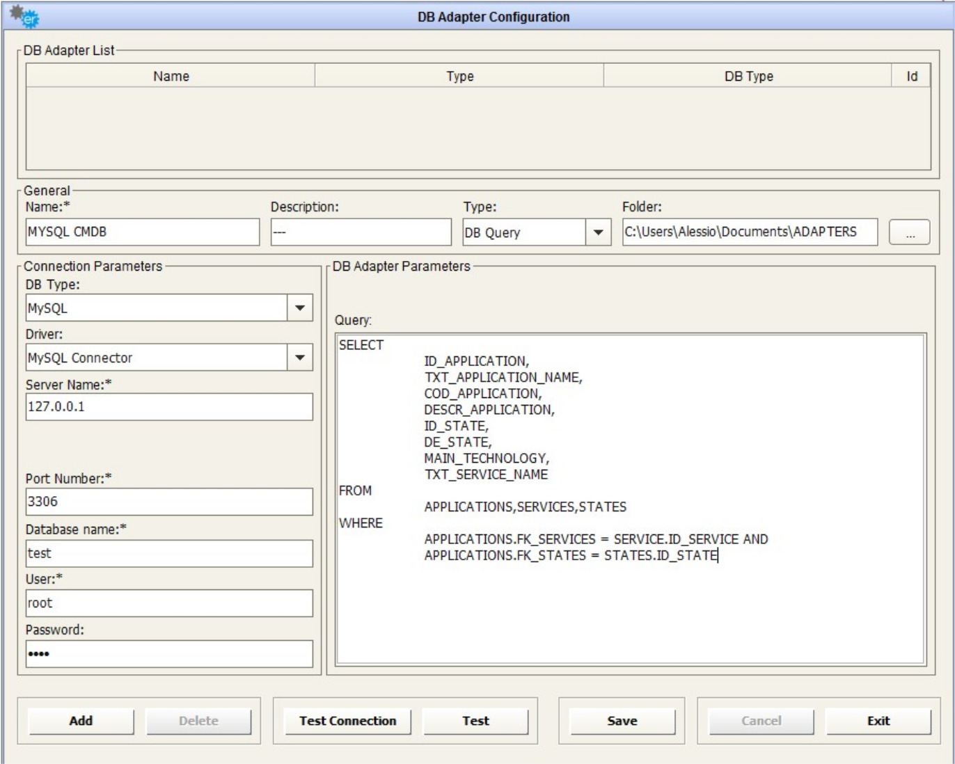 The name, description, type and folder (used to save intermediate and result files for adapter execution) of the DB adapter are the first fields to enter in the form; then for any type of DB Adapter the user must provide connection parameters and adapter details as described below.