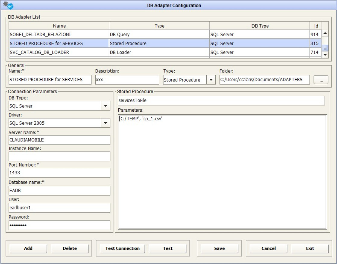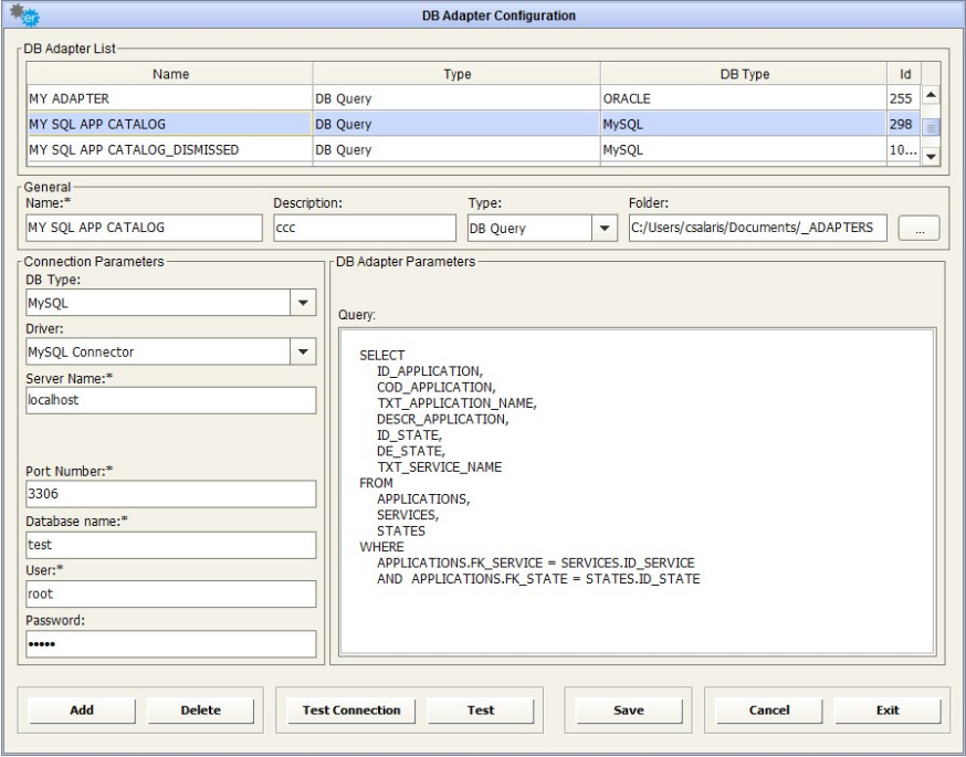 For every type, to save the new DB Adapter just created, press the button. The adapter will be saved and added to the DB Adapter List at the top of the window. Only if the Test Connection (and query execution, for that type) have valid results, the DB Adapter will be saved.