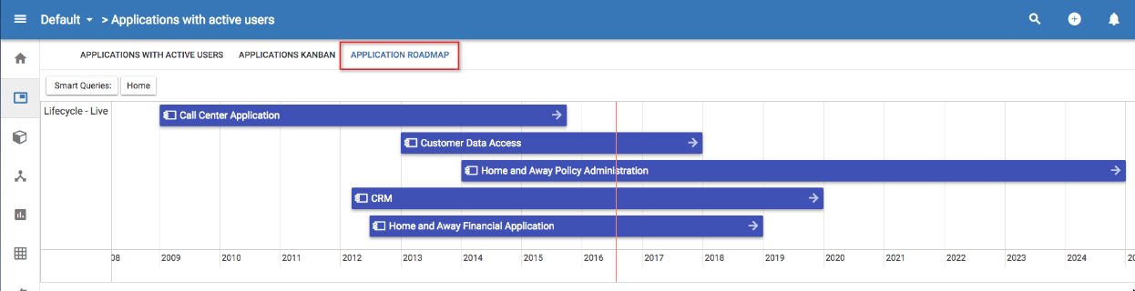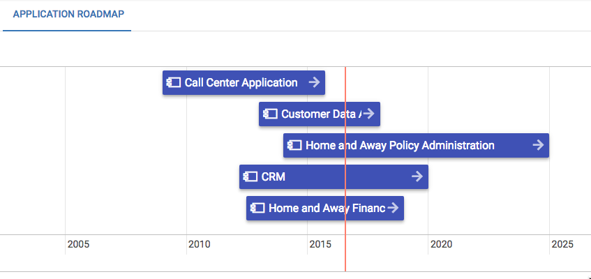 This roadmap shows us the time frames that the Application components are in, for the Live lifecycle status phase - clicking the arrows at the end of the colored blocks will open the object details.