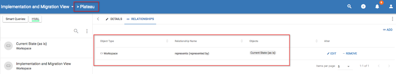 Plateaus can be connected using the 'Represents' relationship list, which creates a relationship to the workspace object that it is 'representing' - This will also populate the return view, creating a relationship from the workspace object to the Plateau, using the 'represented by' relationship.