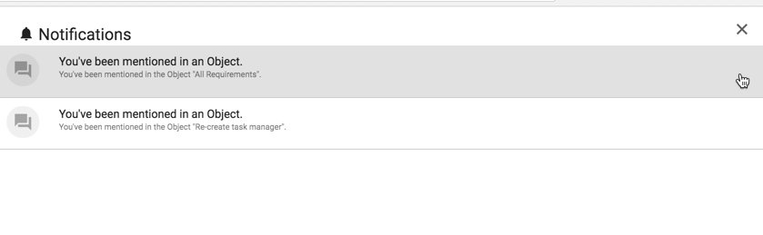 When this is selected, the user will see all unseen messages in a drop down pane - Clicking on the notification may cause an action to occur, depending on what the notification is in relation to e.g. clicking on a 'You've been mentioned in' notification will take the user to the object, daigram or view in question.