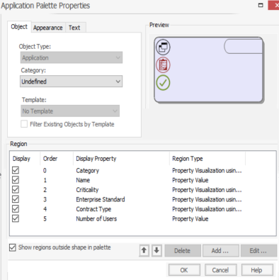 Additional options appear based on the Palette Properties in Modeler. For example, the below options appear for Application Object Type.
