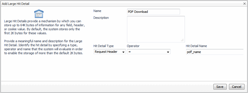 TIP: To match multiple hit details with a single rule, select from operators such as starts with, matches, or contains and specify the text to match in the Hit Detail Name.
