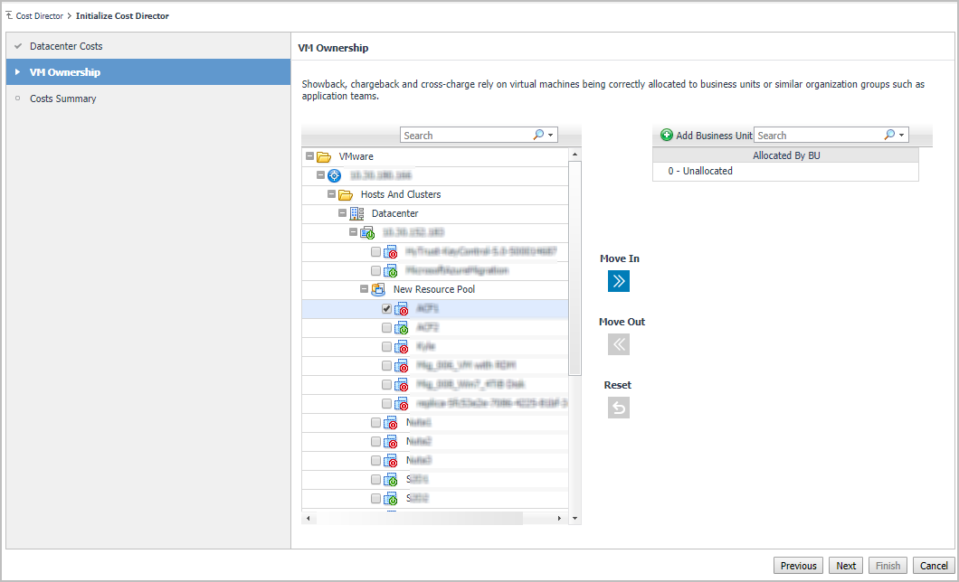 Select the unallocated VMs from the left table, and then click Move In to assign the selected virtual machines to the specified Business Unit, as needed. Click Next.