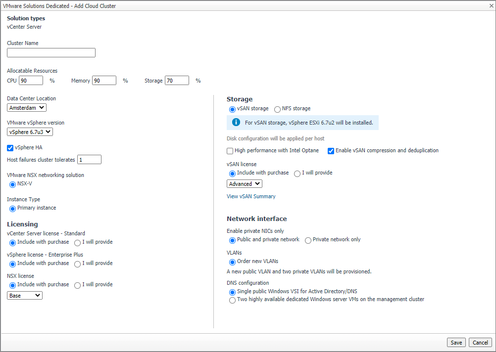Click New Cloud Cluster and a VMware Solutions Dedicated dialog box will appear. Specify a cloud cluster name, make necessary changes, and click Save.