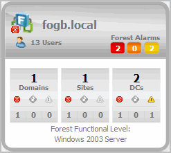 The Forests Environment Summary (All Forests) view displays a forest tile for each forest in your Active Directory® environment that provides summary data about the different object types (domains, sites and DCs) within each forest and the number of objects in each of the alarm states (fatal, critical and warning).
